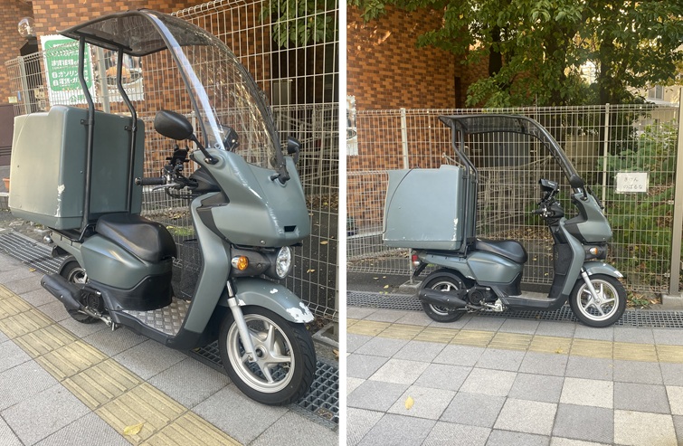 原付二種のベンリィ110、大きな屋根とシールドにリアボックス付き。
